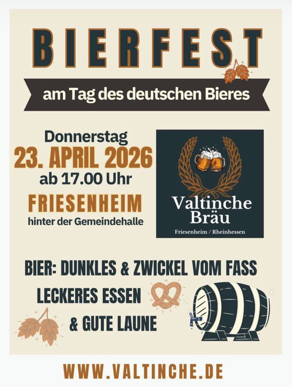 Die Brauerei Valtinche Bräu lädt am 23. April 2026 zum gemütlichen Bierfest nach Friesenheim ein. Hinter der Gemeindehalle warten kühles Fassbier und eine gesellige Atmosphäre